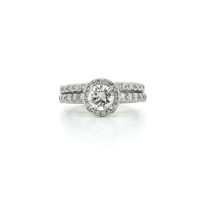 This sophisticated bridal set showcases a 0.75-carat EGL USA certified colorless natural round brilliant diamond as the focal point, enhanced by a luminous halo of diamonds. The accompanying wedding band and accent stones contribute an additional 0.75 carats of brilliance, bringing the total to 1.50 carats. Set in enduring 14kt white gold, this pairing delivers the clarity and fire expected in fine bridal jewelry. The professional certification ensures confidence in your investment, while the classic halo design offers both elegance and timeless appeal.