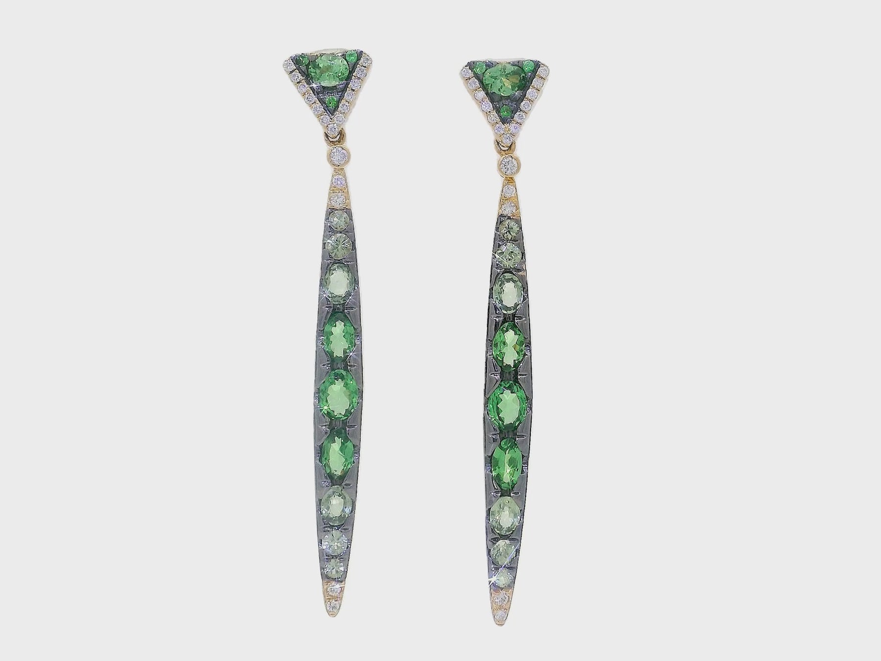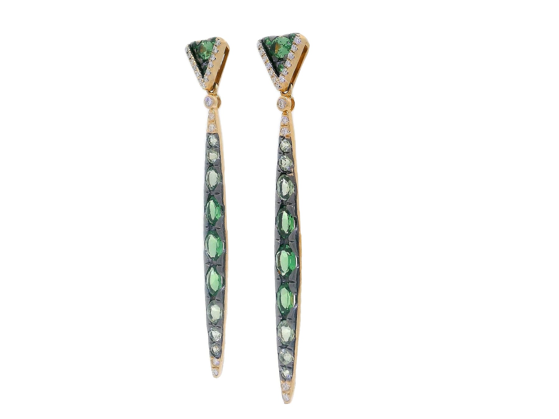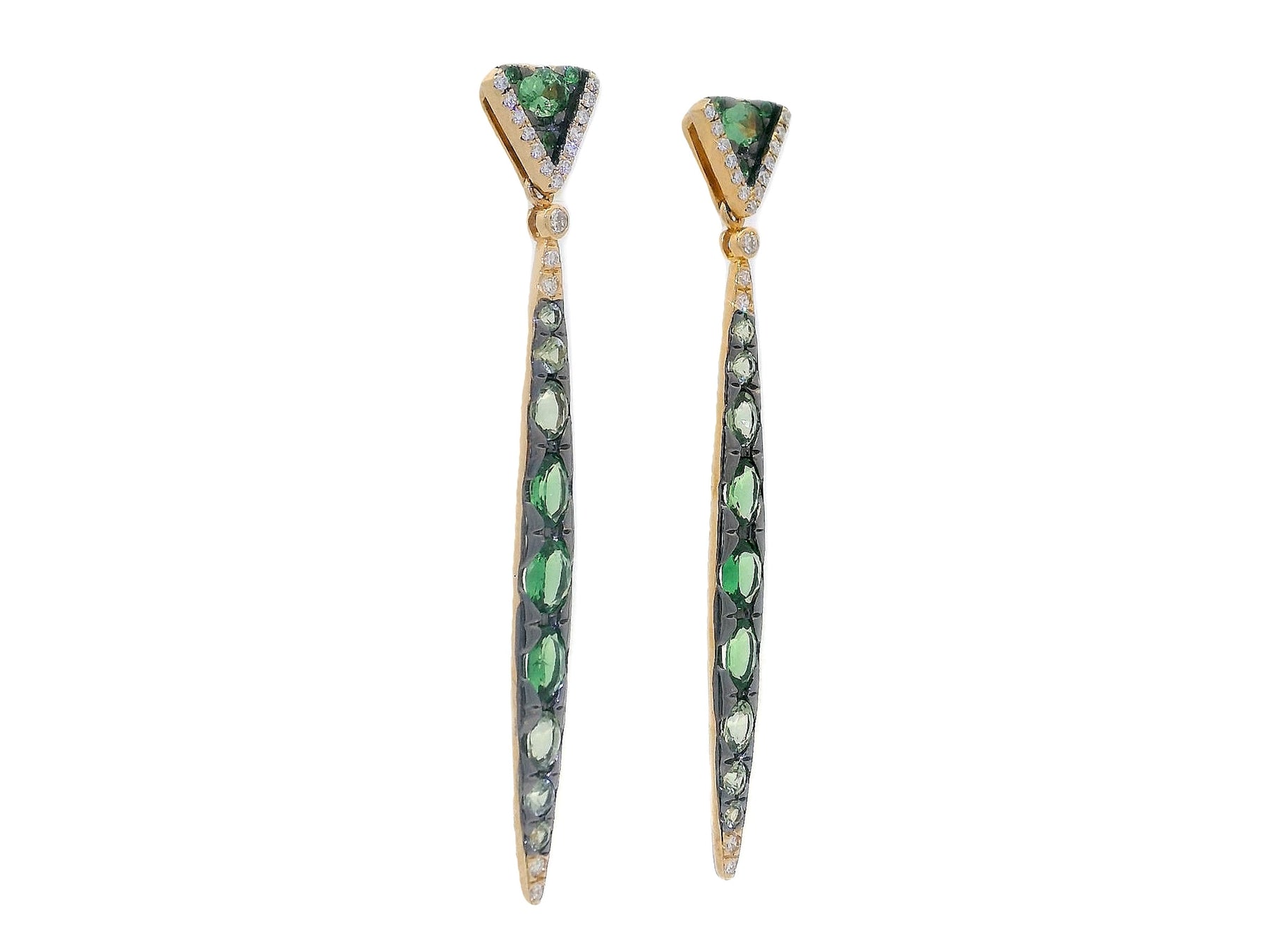 These stunning earrings feature a captivating design adorned with 4.47 carats of rare vibrant green garnet gemstones and 0.65 carats of natural diamonds. The elongated shape adds a touch of sophistication, making them perfect for both formal occasions and everyday wear. Crafted with precision, they are sure to catch the light and turn heads wherever you go.