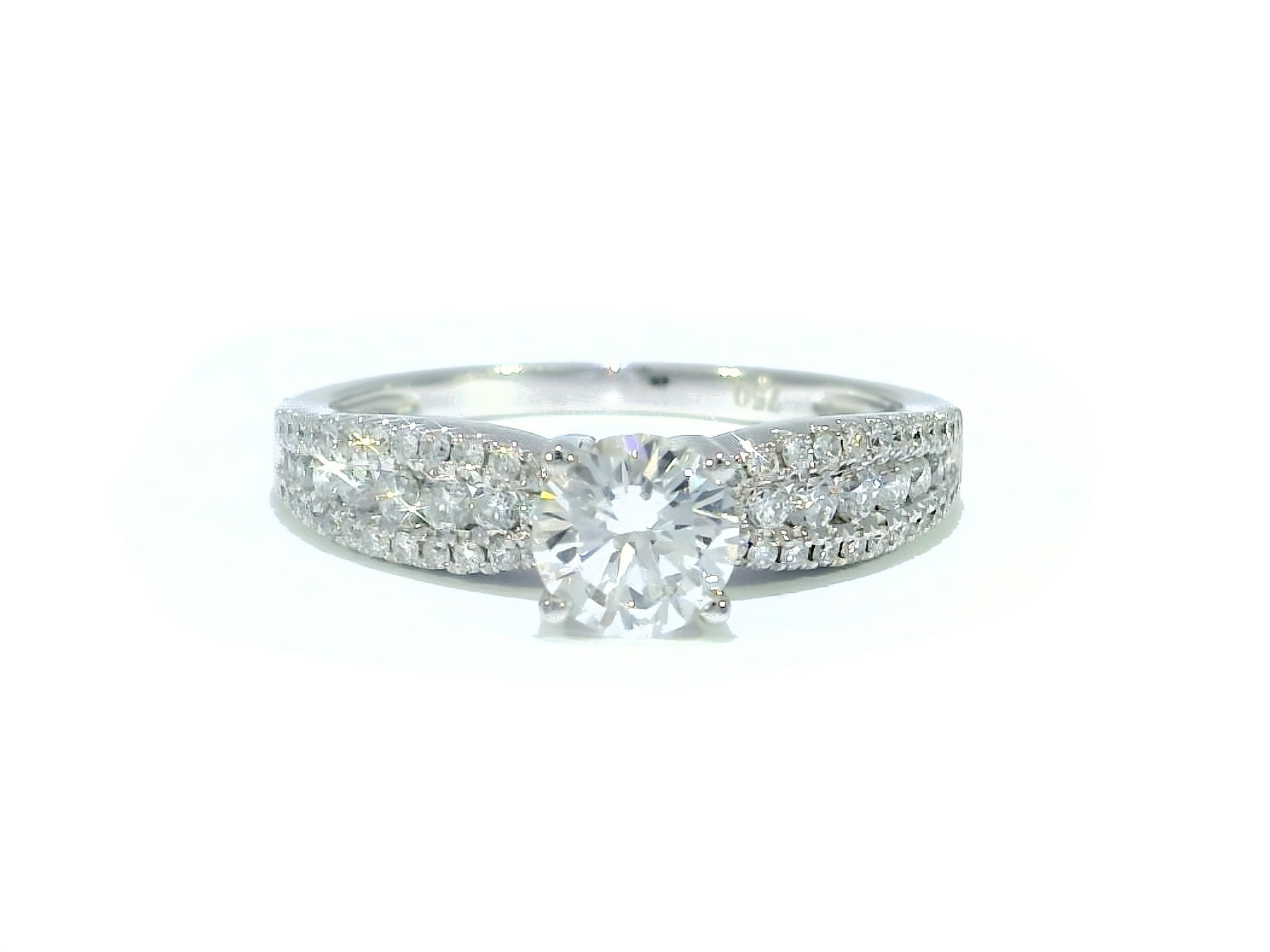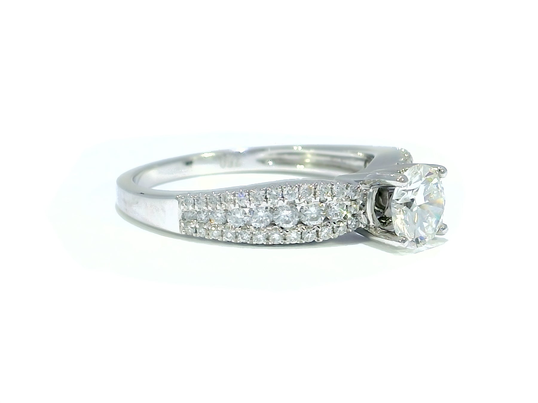 | Setting | 0.59 carat center natural diamond in a four-prong setting. Mounting contains 66 round brilliant cut natural diamonds that are F–G color, VS₁–VS₂ clarity with total weight 0.75 carats. |