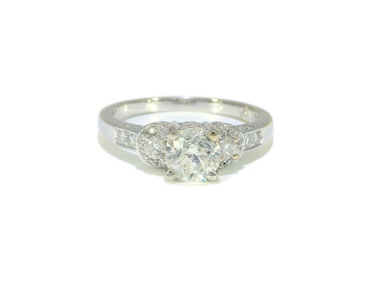 Setting 0.85 carat natural center diamond in a four-prong setting. Mounting contains 0.40 carats (30) round brilliant cut natural diamonds that are F–G color, SI₁–SI₂ clarity. Total weight is 1.25 carats.