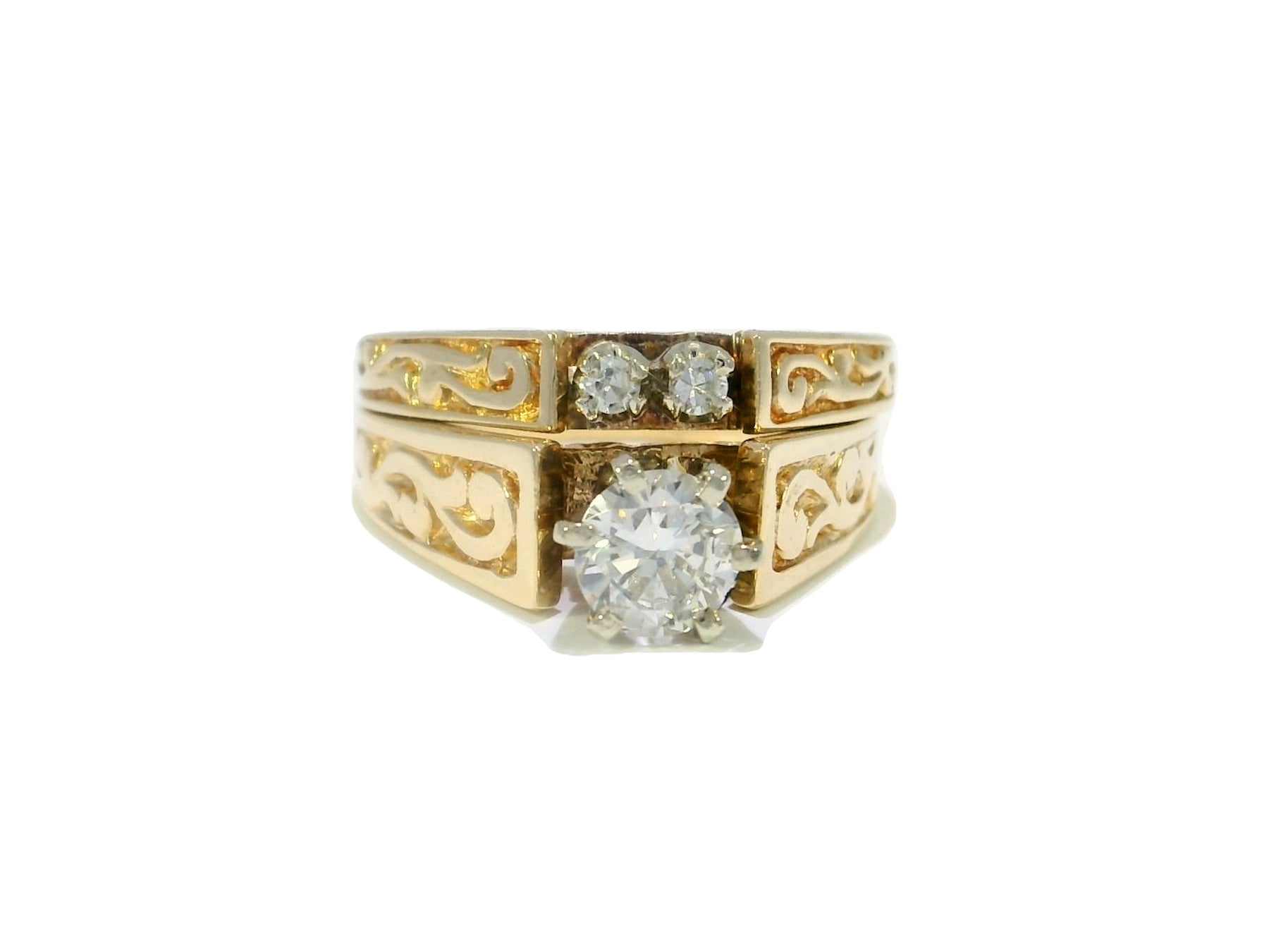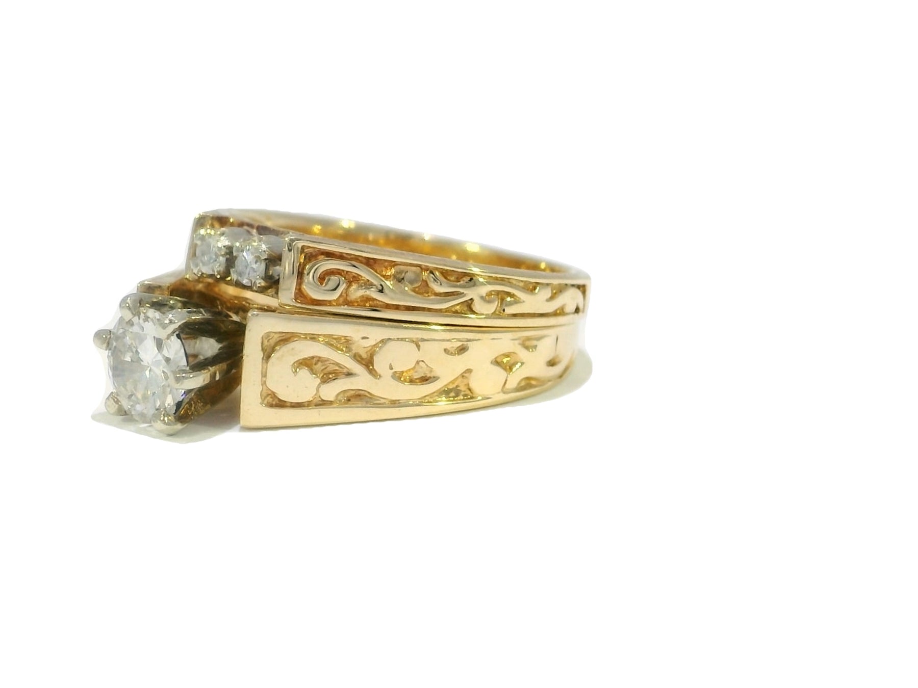 An EGL-certified, colorless, 0.55-carat round brilliant Natural Diamond headlines the engagement ring in a secure six-prong setting adorned with a charming, ornate side design.  Two round brilliant accent diamonds adorn the wedding band, bringing the bridal set’s diamond weight to 0.61 carats.  This classic 14kt yellow gold set delivers bright, refined brilliance for a lifetime.