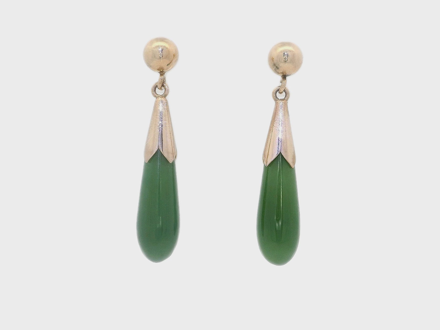 Natural Green Jade Drop Earrings in 14KT Yellow Gold
