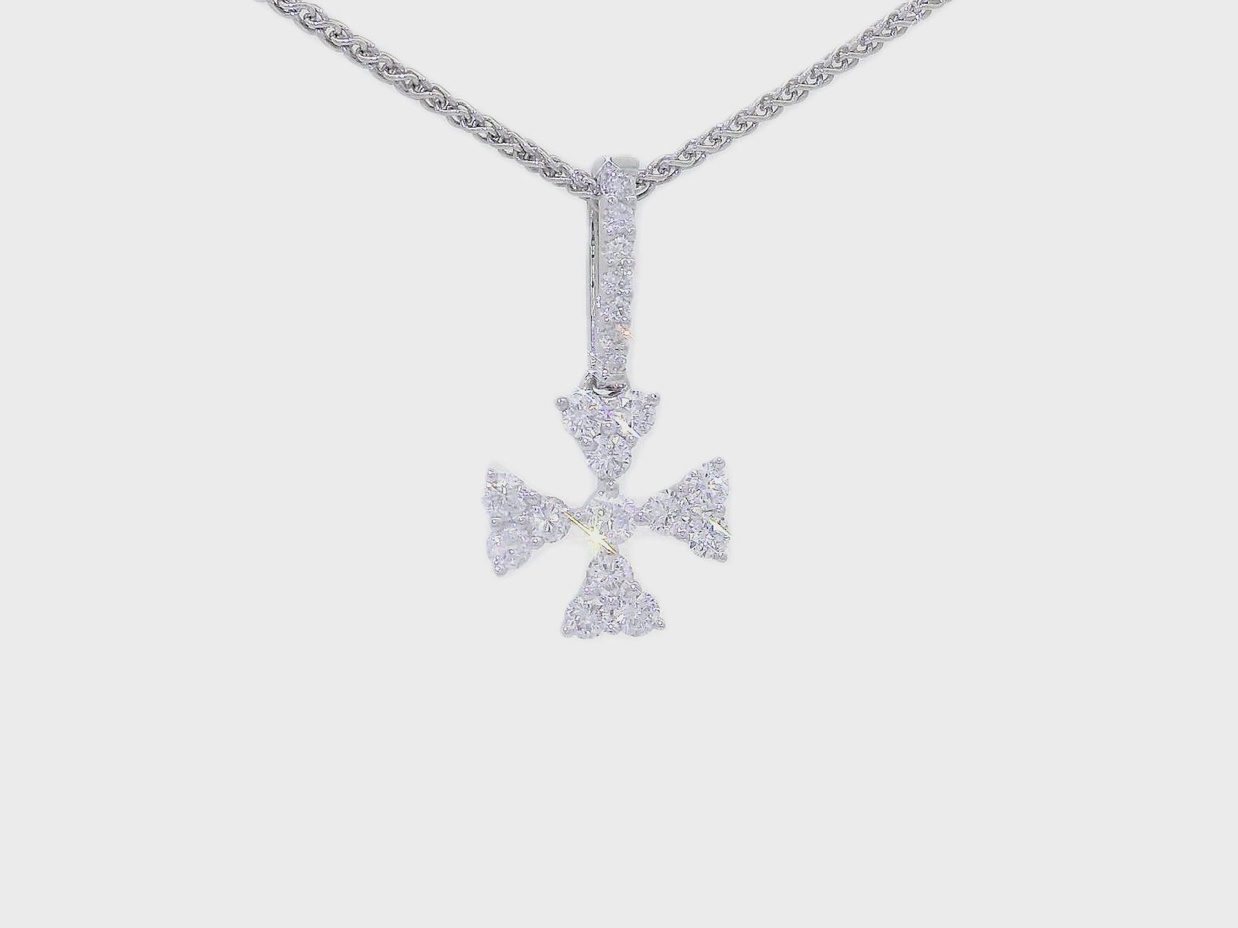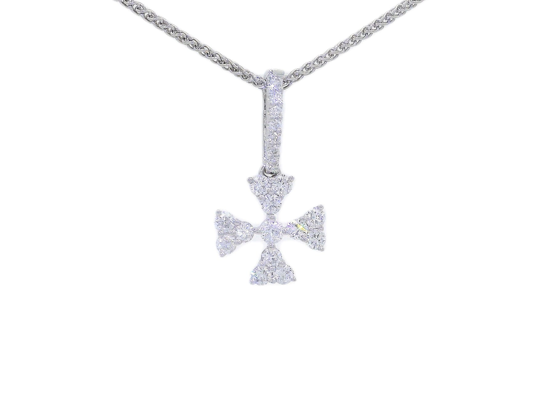 This radiant Maltese Cross pendant necklace features 0.45 carats of sparkling Natural Diamonds, meticulously set in 18KT White Gold.  The striking Maltese Cross—a symbol of protection and honor iconic of the fire service—associated with the fire service, is adorned with brilliant-cut Diamonds that enhance its timeless elegance.  Suspended from a Diamond-accented bail, this pendant is a luminous expression of faith, devotion, and strength.