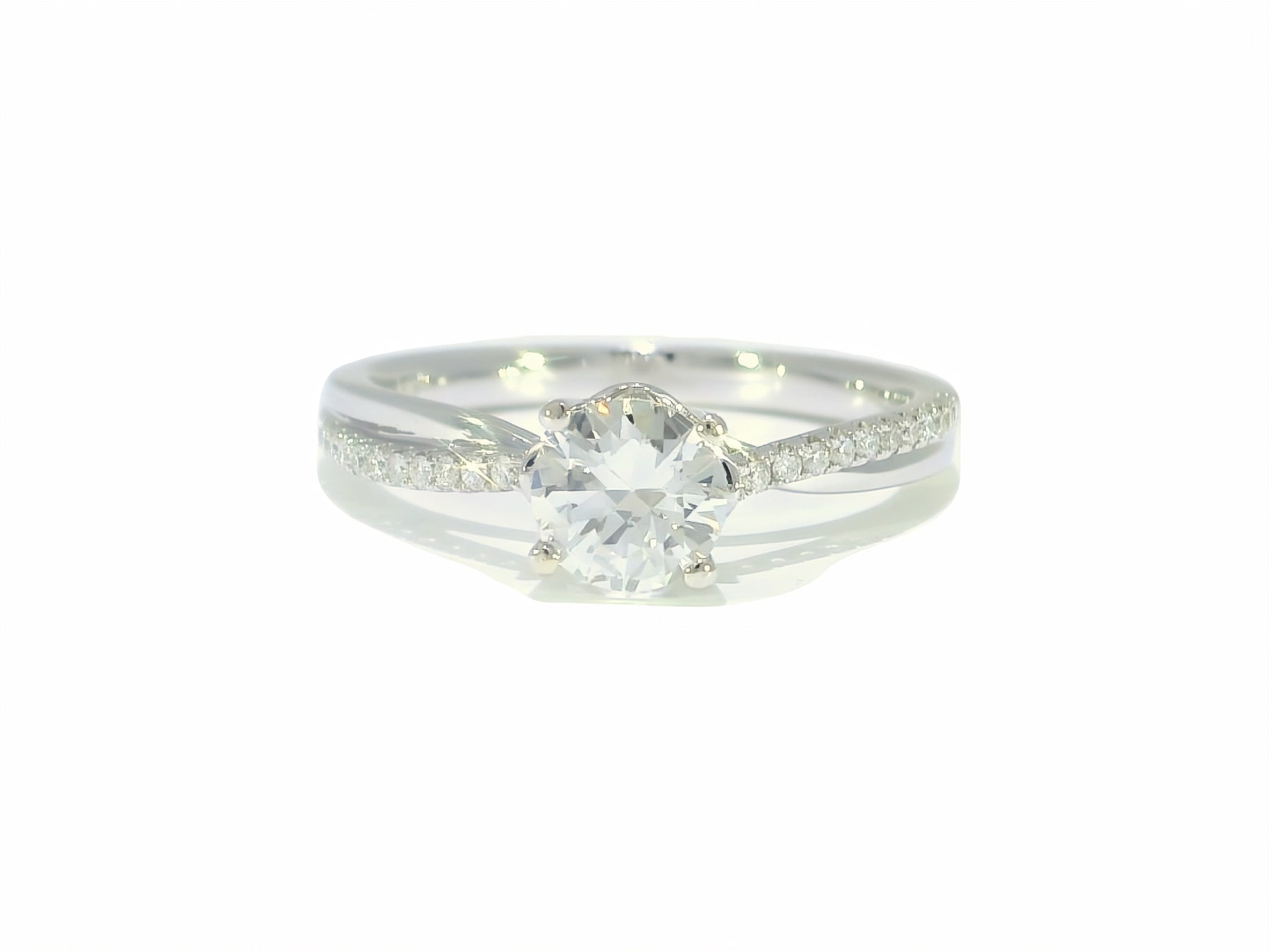 This stunning diamond engagement ring features a brilliant center stone, elegantly set in a delicate band adorned with intricate detailing. Perfect for symbolizing love and commitment, it captures the light beautifully, making it an unforgettable choice for that special moment.