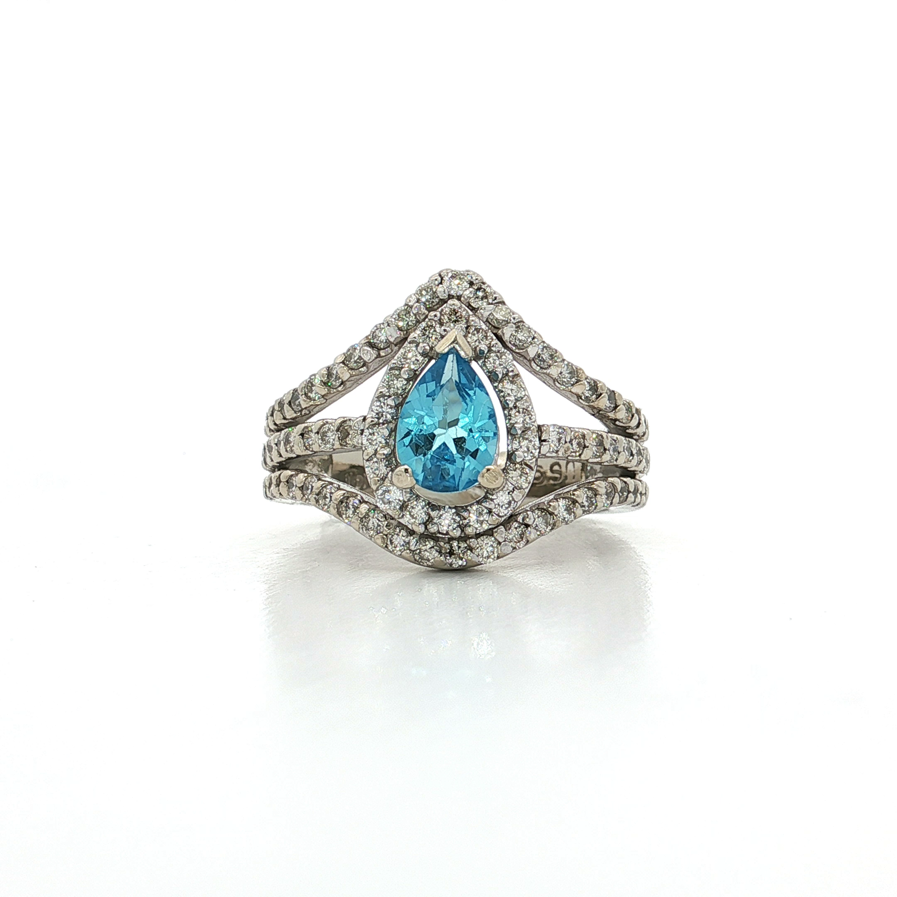 2.75 CTW AAAA-Grade Swiss Blue Pear Shaped Topaz with a Halo and Triple Split Shank of Natural Near-Colorless Round Brilliant Cut Diamonds in a 14kt White Gold Ring