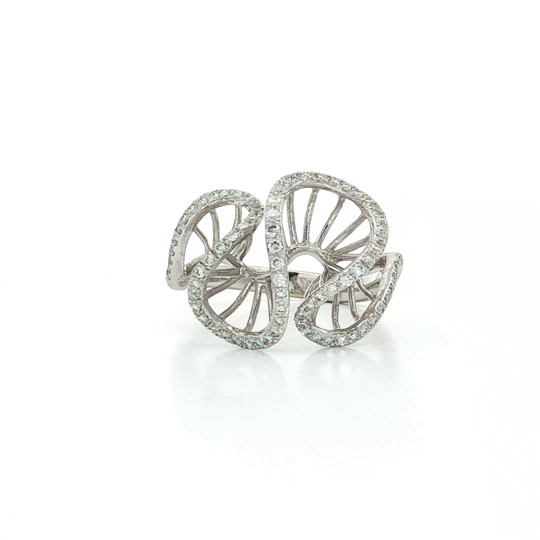 Command attention with this striking abstract design micropavé ring, featuring 0.60 CTW of natural round brilliant cut colorless diamonds set in contemporary 14kt white gold. The bold, sculptural openwork design creates a modern interpretation of the classic cocktail ring, with geometric lines and negative space that showcase both the diamonds and the artistry of the metalwork. Colorless diamonds deliver exceptional brilliance and clarity, while the micropavé setting ensures maximum sparkle across the band. Perfect for those who embrace individuality and contemporary style, this statement piece elevates any occasion—from evening events to everyday glamour. An investment in artistic craftsmanship that celebrates modern elegance and timeless sophistication.