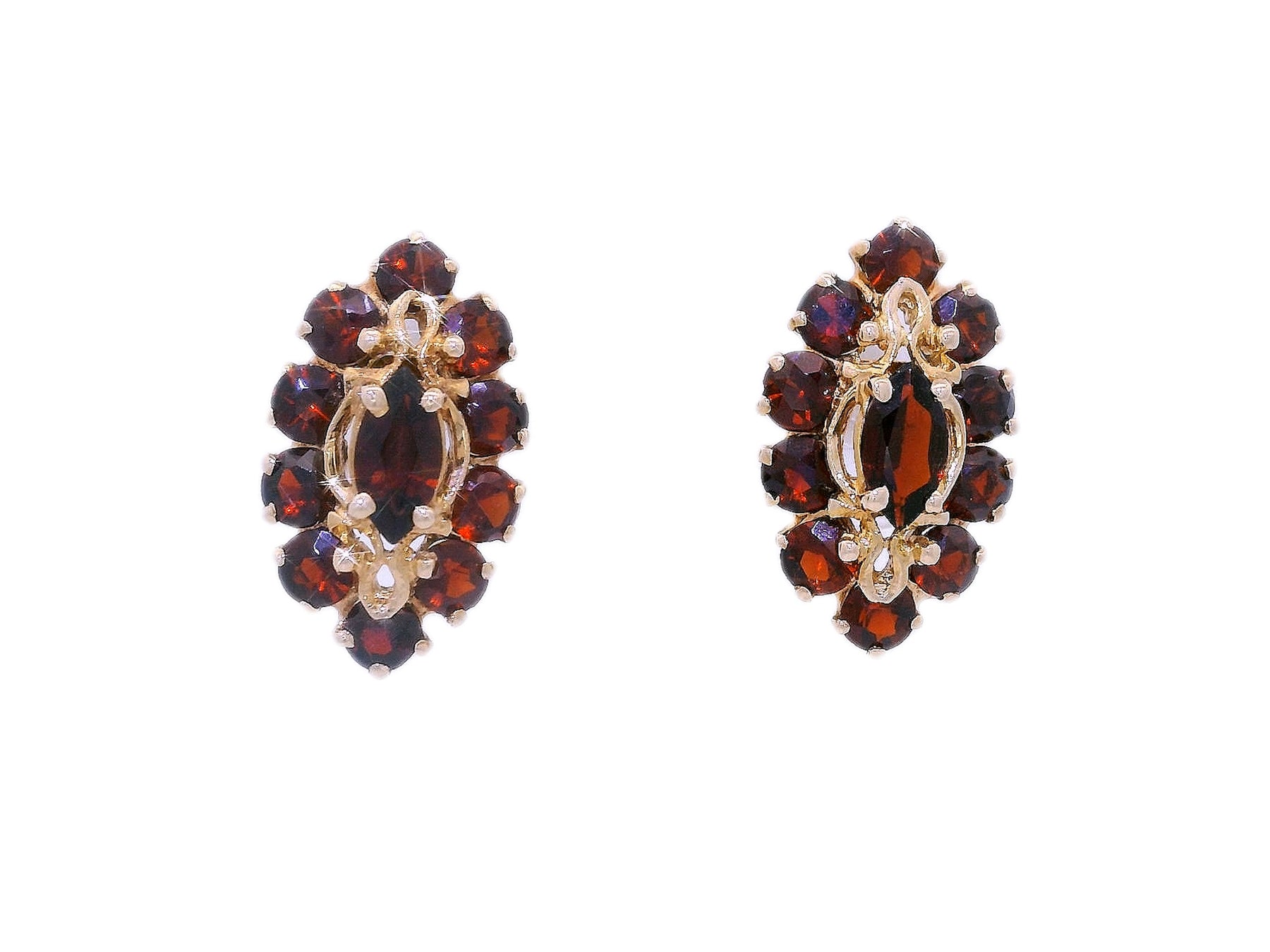 These exquisite Natural Garnet earrings feature 20 vibrant Garnets, including 2 marquise-cut center stones and 18 round-cut accents, beautifully arranged in classic 14KT Yellow Gold. This marquise-shaped cluster design and deep Garnets offer rich color and vintage-inspired elegance, perfect for adding warmth and sophistication to any ensemble.