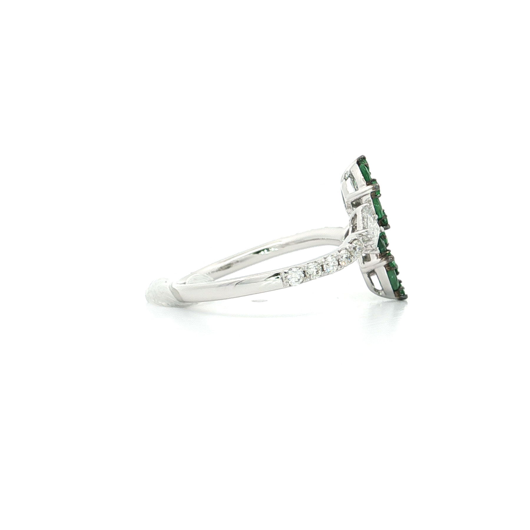 Embrace sophisticated style with this captivating emerald and diamond bypass ring, showcasing AA-grade emerald clusters totaling 0.14 carats that glow with rich, verdant allure. Paired with 0.20 carats of colorless, near-flawless round brilliant and baguette diamonds, this design creates a stunning fusion of color and radiance. The distinctive bypass band adds contemporary movement and visual depth, allowing each gemstone to command attention. Crafted in cool 14kt white gold, this 0.34 CTW ring delivers refined elegance with modern appeal. Perfect for those who value distinctive artistry and fine craftsmanship, this emerald masterpiece promises to be treasured as a symbol of your refined aesthetic—a meaningful piece that celebrates both luxury and enduring beauty with authentic sophistication.
